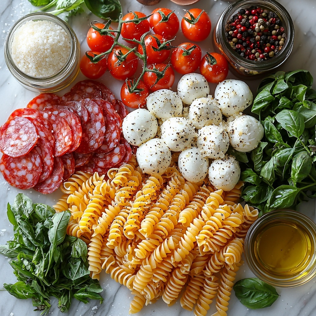Start by grabbing a large mixing bowl where you’ll toss together the cooked fusilli pasta, halved mozzarella balls, quartered salami, chopped artichoke hearts, halved cherry tomatoes, and sliced black olives. This mix packs a wonderful combination of textures and flavors that form the heart of your pasta salad.