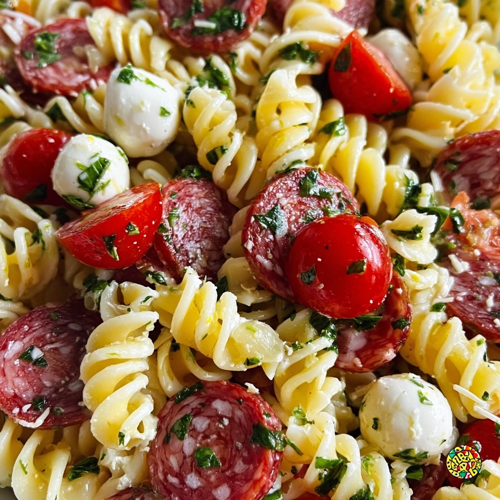 A vibrant and flavorful Best Pasta Salad featuring cooked fusilli pasta, fresh mozzarella balls, savory salami, artichoke hearts, cherry tomatoes, and black olives, all tossed in a zesty homemade dressing made from extra-virgin olive oil, garlic, apple cider vinegar, fresh parsley, and Italian seasoning. This easy-to-make salad is perfect for gatherings, picnics, or as a refreshing side dish.