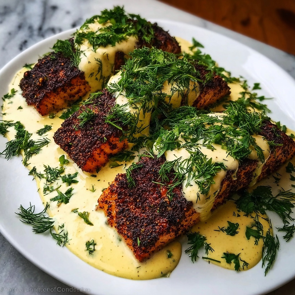 A flavorful and quick recipe featuring blackened salmon fillets cooked to perfection in a skillet, served with a rich and creamy Dijon mustard sauce. This dish is bursting with Cajun spices and complemented by fresh lemon juice and dill, perfect for a healthy and delicious dinner in just 30 minutes.