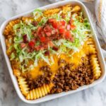 This Cheeseburger and Fries Casserole is a comforting and hearty dish that combines crispy crinkle cut fries with seasoned ground beef and melted American cheese, topped with a tangy homemade sauce and fresh burger toppings. Perfect for a crowd-pleasing dinner, this casserole delivers all the flavors of a classic cheeseburger in an easy-to-make baked casserole form.