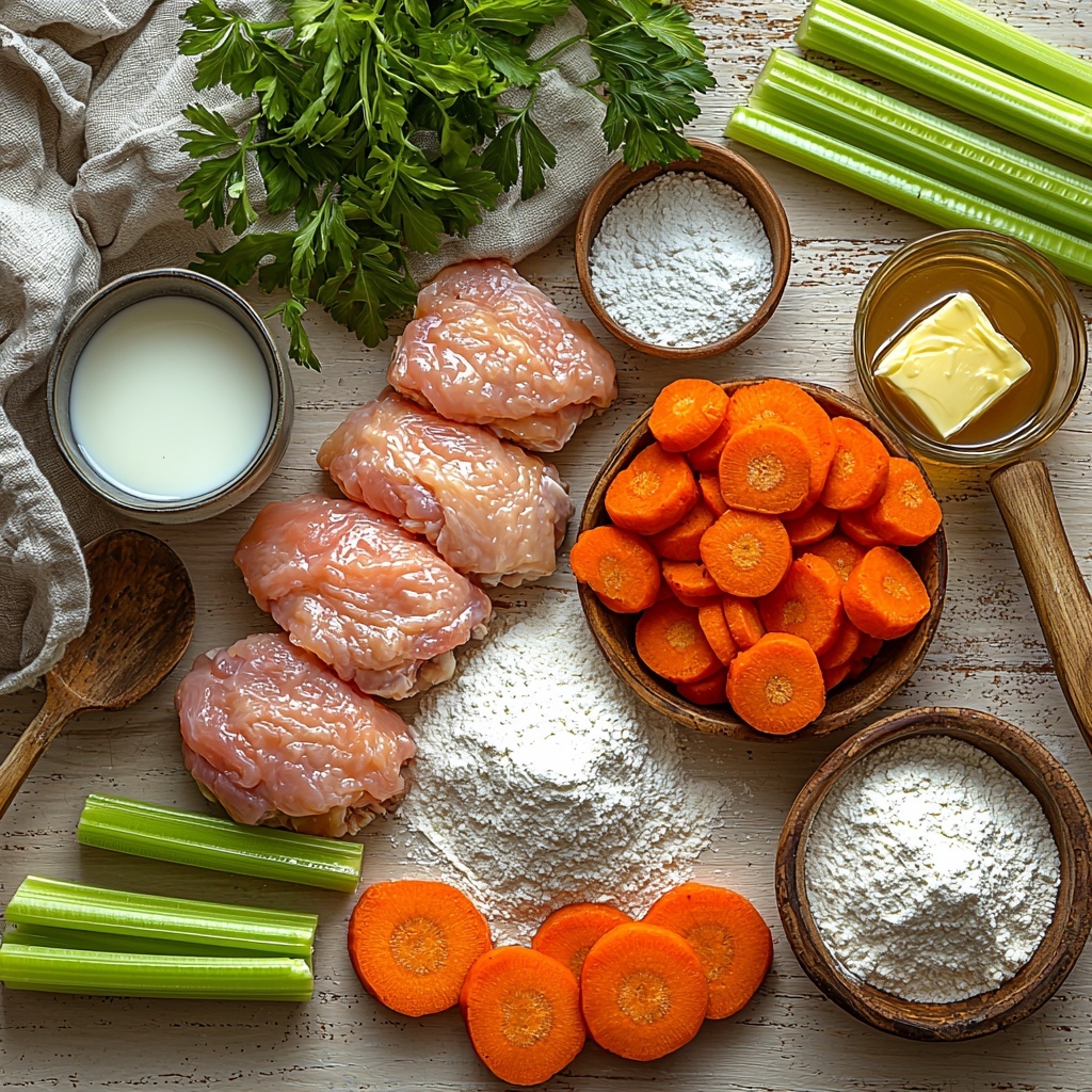 For this Chicken and Dumplings Recipe, we keep the ingredients uncomplicated yet essential, ensuring each one plays a crucial role in building layers of flavor, texture, and color. From juicy chicken thighs to fresh carrots and celery, and a simple dumpling batter that bakes up light and tender, every component is carefully chosen to make this dish unforgettable.