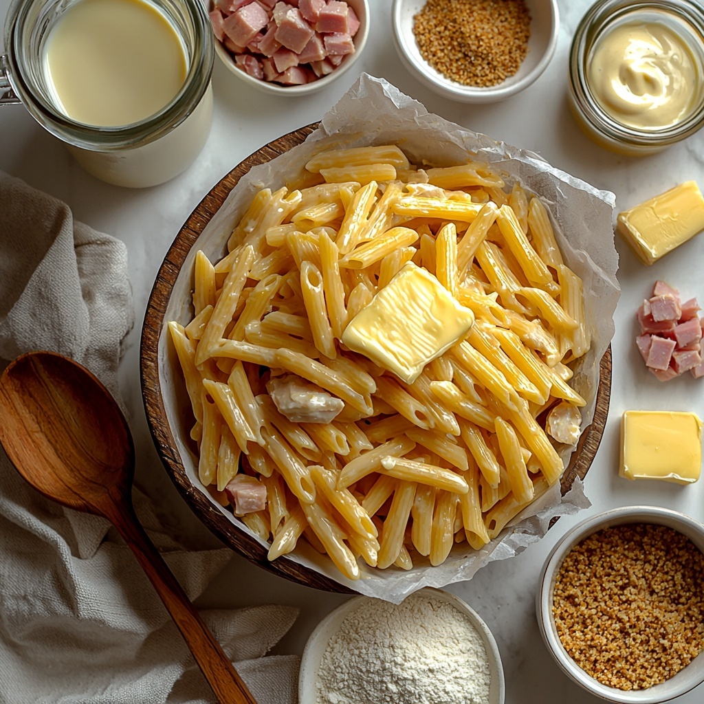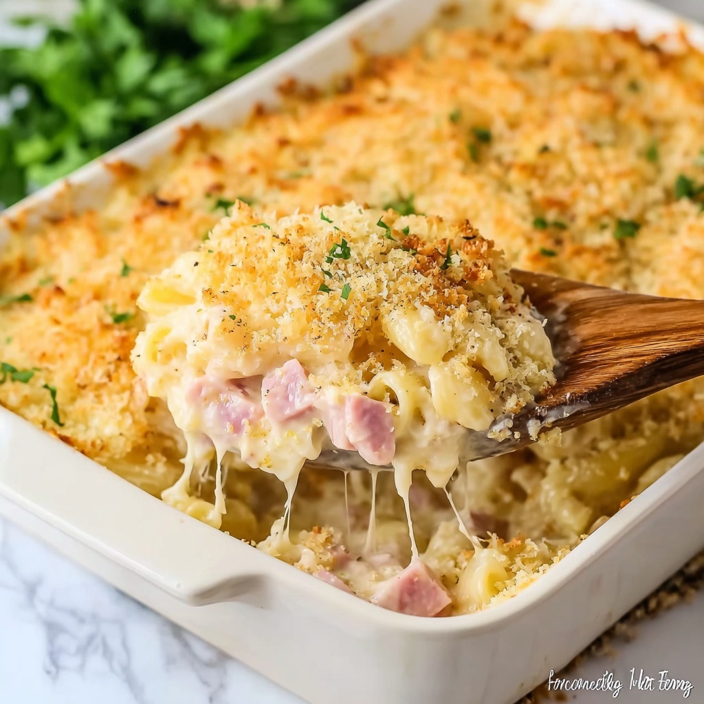 Drain the cooked pasta and transfer it to a large mixing bowl. Add the chopped cooked chicken and ham, then pour the creamy sauce over everything. Gently toss until all the components are evenly coated and well combined. This is where the magic happens—bringing together the textures and flavors that promise pure comfort in every bite.