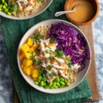 Now for the fun part! Divide the cooked quinoa among four bowls, shaping it on one side in a neat crescent moon—this little presentation trick makes the bowl instantly more elegant. Layer the shredded chicken, finely shredded cabbage, warmed edamame, and juicy mango on the other side. Each ingredient adds its own exciting texture and flavor, inviting you to mix it all together or enjoy each bite distinctly.