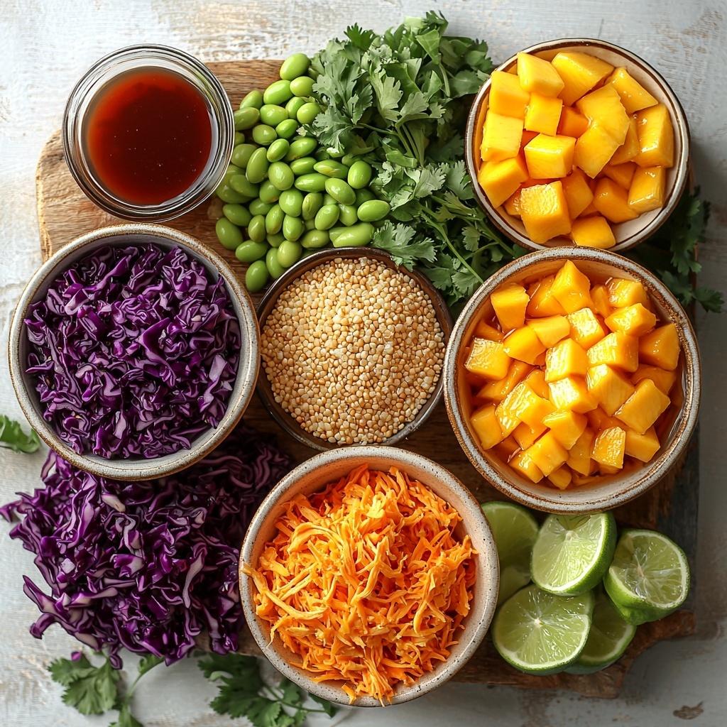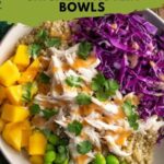 4. Assemble Bowls: Divide the cooked quinoa evenly among four medium-sized bowls, arranging it on one side in a crescent moon shape. Top the quinoa with shredded rotisserie chicken, shredded purple cabbage, warmed edamame, and chopped mango layered evenly.