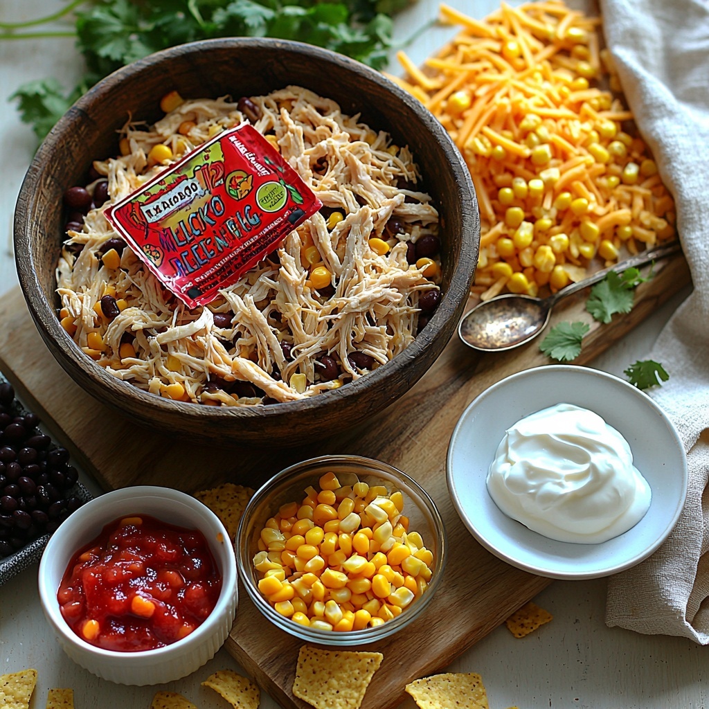 Begin by preheating your oven to 350°F (175°C) so it reaches the perfect baking temperature while you get everything else ready. In a large bowl, combine the shredded chicken, drained black beans, corn, taco seasoning, and salsa. Mixing these together ensures every mouthful bursts with flavor and each bite is evenly delicious.