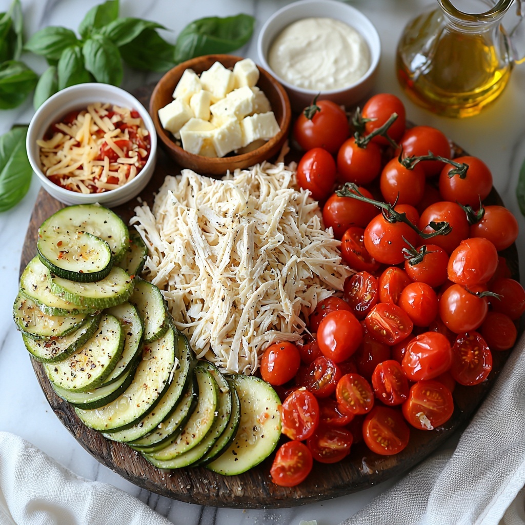 - Mix Ingredients: In a large mixing bowl, combine the shredded cooked chicken, sliced zucchinis, halved cherry tomatoes, shredded mozzarella cheese, softened cream cheese, garlic powder, Italian seasoning, and salt and pepper to taste. Mix thoroughly until all components are well incorporated.