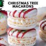 This festive Christmas Tree Cake Macarons recipe combines delicate, crisp-edged French macarons with a rich, creamy filling inspired by Little Debbie Christmas Tree Cakes. These elegant green macarons are decorated with melted white chocolate, colorful sprinkles, and red buttercream frosting or royal icing to look like holiday trees—perfect for seasonal celebrations or gifting.