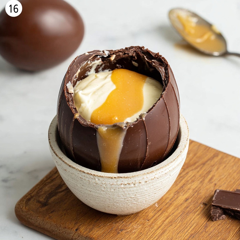 - Seal the eggs: Re-melt the remaining chocolate and place it into a piping bag. Quickly pipe melted chocolate around the rims of the filled half eggs to act as glue. Press two halves together to form full eggs, aligning carefully. Freeze for 10 minutes to firm the seal.