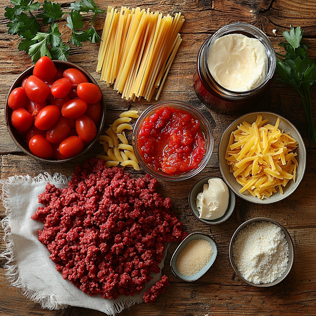 Gathering a few humble yet essential ingredients is all it takes to create this memorable dish. Each component plays a crucial role: from the lean ground beef providing rich flavor and protein, to the ziti pasta offering fun texture, to the cream cheese that adds that silky smooth touch. Here’s what you need to get started:
