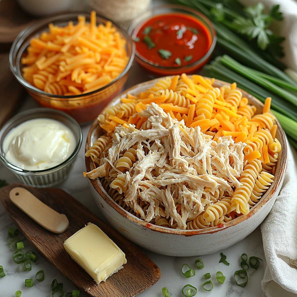 This Ranch Buffalo Pasta Bake is a creamy, cheesy, and spicy casserole that combines cooked shredded chicken, rotini pasta, and a flavorful ranch buffalo sauce. Topped with melted cheddar and mozzarella cheese and finished with fresh green onions, this 35-minute comfort food is perfect for family dinners or gatherings.