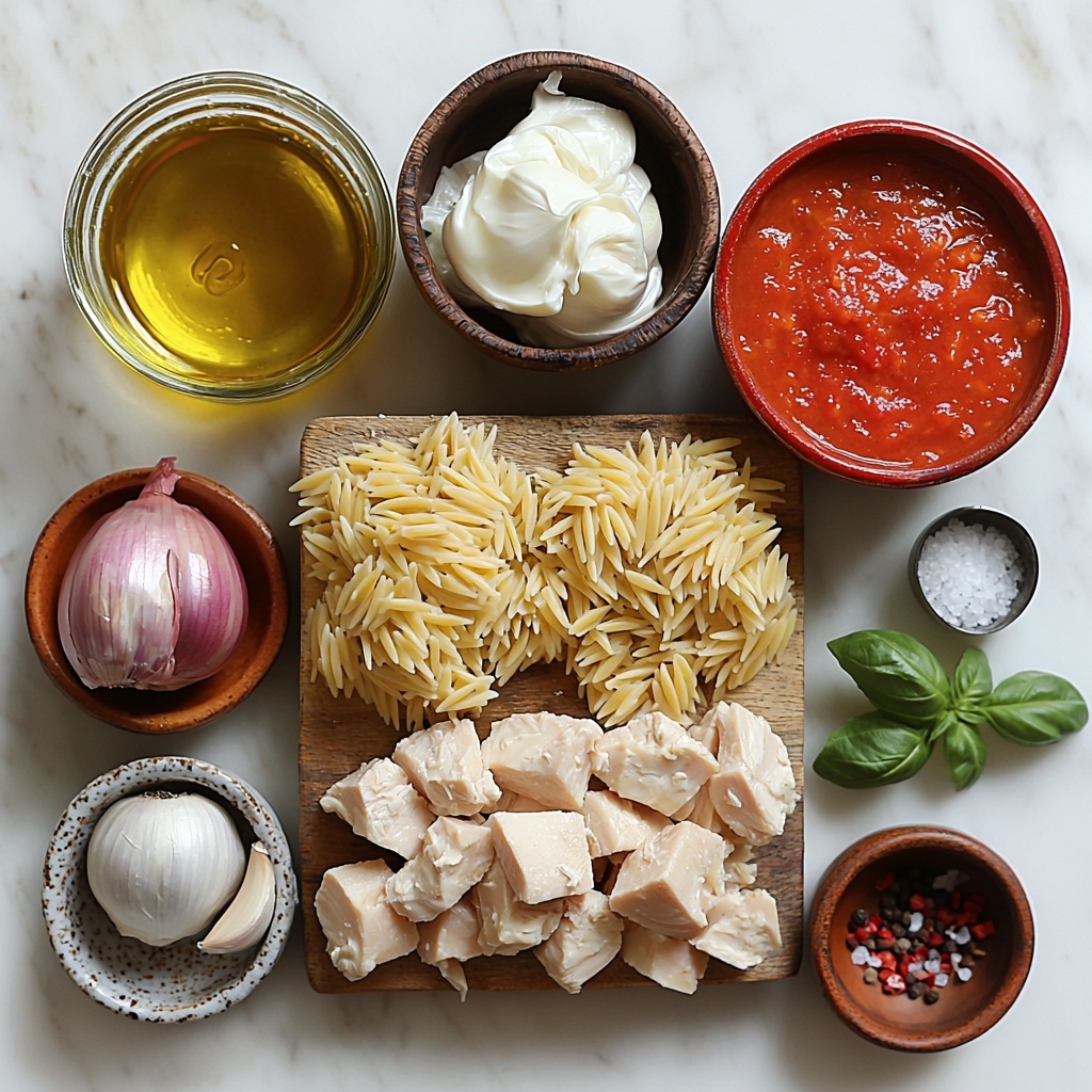 These ingredients are refreshingly simple, yet each plays a crucial role in bringing this Creamy Tomato Orzo with Chicken Recipe to life. From the tender chicken breast to the vibrant tomato sauce and creamy touch of heavy cream, every component adds depth, flavor, and irresistible texture.