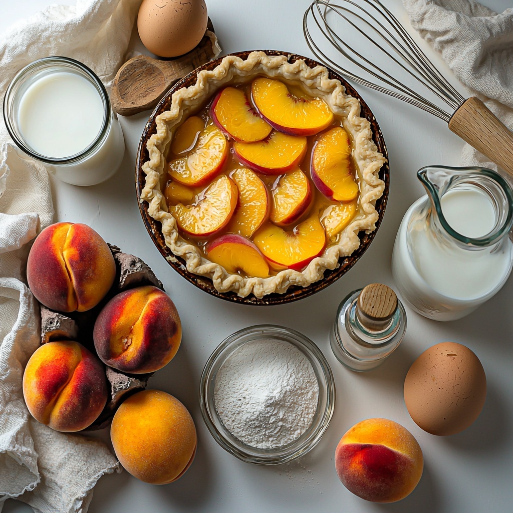 The magic of this pie lies in its simplicity and harmony of textures and flavors. Each ingredient is carefully chosen to build a luscious custard and elevate the natural sweetness of ripe peaches, while the crust provides a perfect buttery foundation.