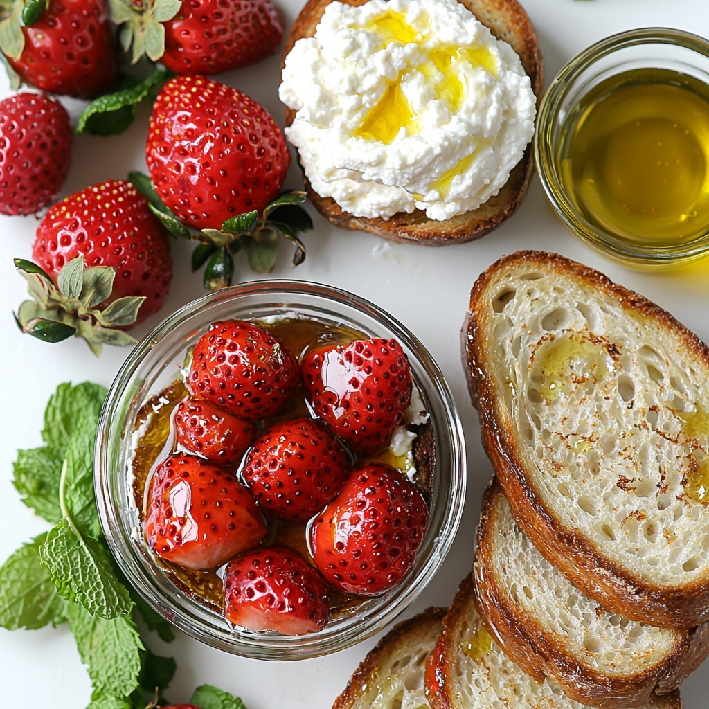 Spread a generous layer of whipped ricotta over each slice of toasted bread, then pile on the warm roasted strawberries. Finish with a sprinkle of fresh mint leaves to add a bright herbal note that elevates the entire flavor profile.