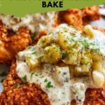 This Dill Pickle Chicken Bake is a tangy, flavorful dish featuring seasoned chicken breasts topped with a creamy dill pickle ranch dressing and a crispy Parmesan breadcrumb crust. Cooked quickly in the air fryer, it delivers juicy, perfectly cooked chicken with a crunchy topping, garnished with fresh dill for a delightful finish.