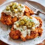 This Dill Pickle Chicken Bake is a tangy, flavorful dish featuring seasoned chicken breasts topped with a creamy dill pickle ranch dressing and a crispy Parmesan breadcrumb crust. Cooked quickly in the air fryer, it delivers juicy, perfectly cooked chicken with a crunchy topping, garnished with fresh dill for a delightful finish.