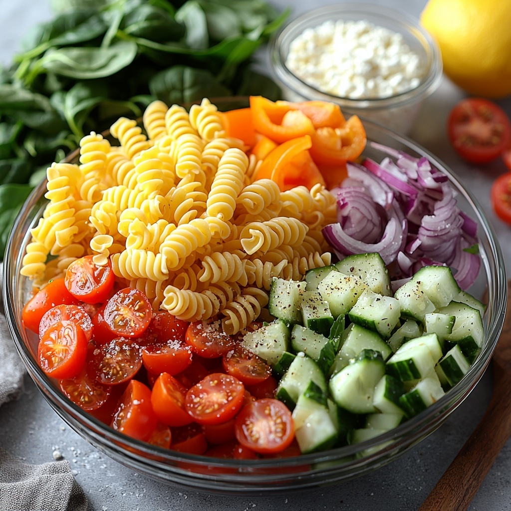 While the pasta is cooking, dice your cucumber, tomatoes, yellow bell pepper, and finely chop the red onion and spinach. These fresh veggies are the backbone of your salad’s crisp and colorful texture, providing a refreshing contrast to the creamy cottage cheese.