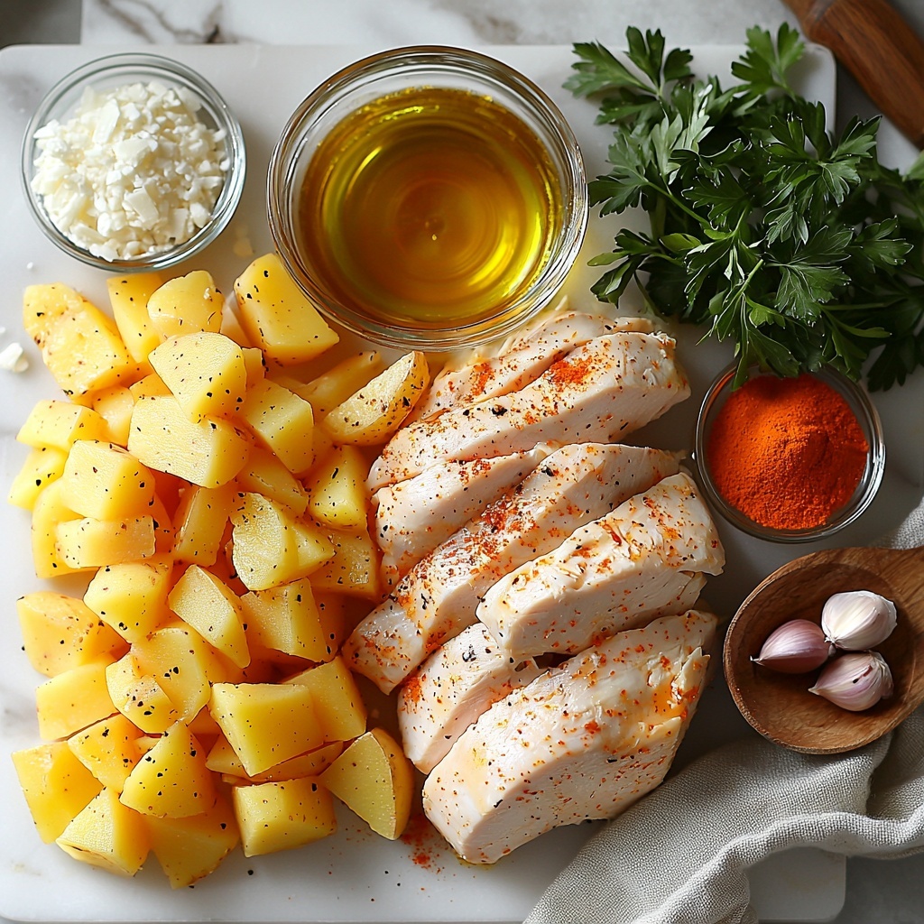 Grease a baking dish lightly and start layering half of the sliced potatoes evenly across the bottom. Next, place the browned chicken breasts on top of the potatoes, then gently pour the creamy garlic sauce over the chicken and potato layer to soak everything with flavor.