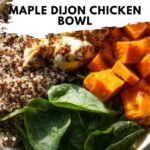 This Maple Dijon Chicken Bowl with Roasted Sweet Potatoes is a delicious and nutritious meal featuring tender chicken breasts coated in a sweet and tangy maple Dijon glaze, paired with oven-roasted sweet potatoes, fresh spinach, and fluffy quinoa. A perfect balance of flavors and textures makes this bowl an easy and wholesome dinner option.