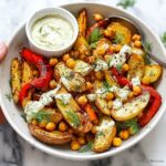 This vibrant Mediterranean Bowls recipe features a delightful combination of roasted chickpeas, bell peppers, onions, and potatoes seasoned with aromatic herbs and spices, paired with a creamy, dairy-free tzatziki sauce made from vegan yogurt, cashews, tofu, and fresh dill. Perfect as a wholesome, flavorful meal that’s both nourishing and satisfying.