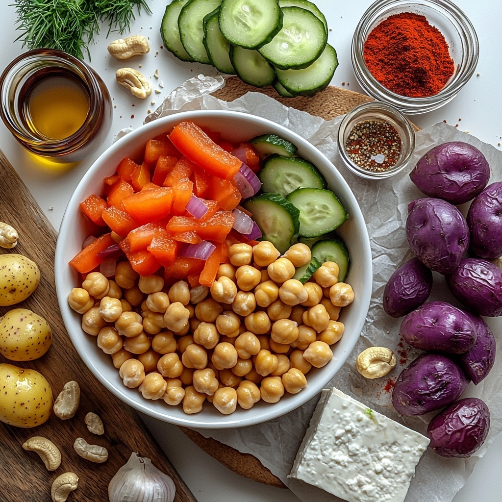 The magic of this dish lies in its simple, wholesome ingredients that each play a crucial role in delivering a colorful, delicious bowl. From hearty chickpeas and golden mini potatoes to the creamy, refreshing tzatziki with fresh dill and garlic, every component elevates the final dish.