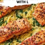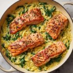 A delicious and easy one skillet salmon dish featuring perfectly seared salmon fillets served over creamy lemon orzo with spinach and Parmesan. This wholesome meal comes together quickly, combining tender salmon with flavorful orzo cooked in chicken broth, enhanced with garlic, onion, and fresh lemon juice for a vibrant finish.