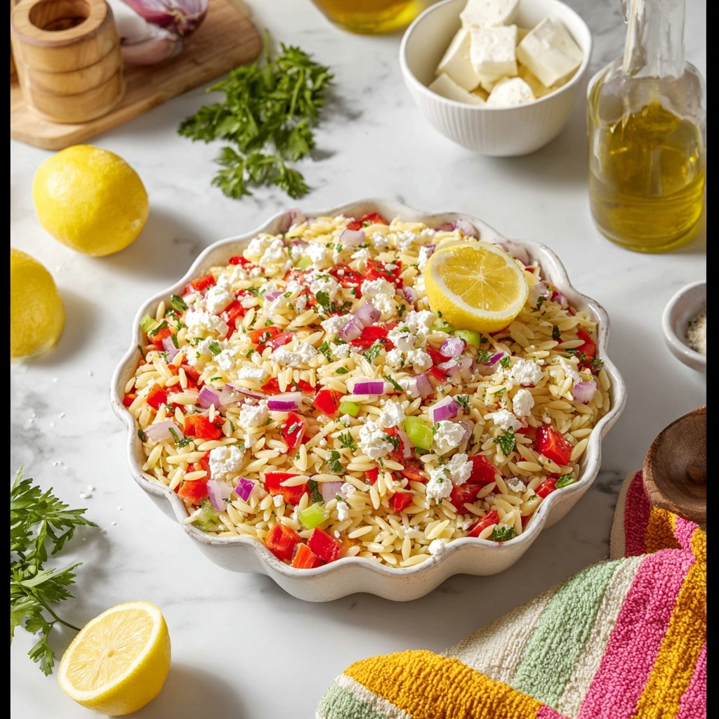 This refreshing Orzo Lemon Salad combines tender orzo pasta with crisp red bell pepper, celery, and red onion, all tossed in a zesty lemon dressing and topped with creamy feta cheese. Perfect as a light lunch or bright side dish, this salad is quick to prepare and bursting with fresh flavors.