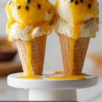 If you want to impress guests with a creative twist, try serving the ice cream scoops in hollowed-out passion fruit shells for an authentic and eye-catching presentation. Alternatively, layer the ice cream with passion fruit coulis and crushed nuts to create a visually striking parfait. For a simple yet elegant dessert, plate the ice cream with delicate edible flowers and a drizzle of extra passion fruit coulis.