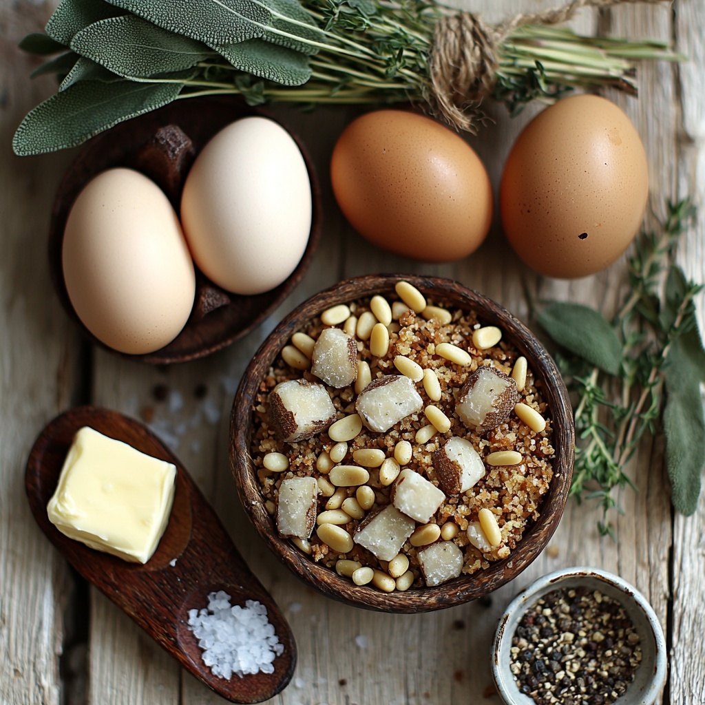- Mix Ingredients: In a large bowl, combine the breadcrumbs, pine nuts, suet, sautéed onion, fresh herbs, salt, and black pepper, mixing thoroughly to distribute all components evenly.