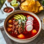 Traditional Mexican Pozole Rojo is a hearty, flavorful pork and hominy stew simmered with rich red chile sauce and aromatic spices. Perfect for festive gatherings, this comforting dish is topped with fresh cabbage, radishes, onion, lime, and oregano for added crunch and brightness.