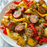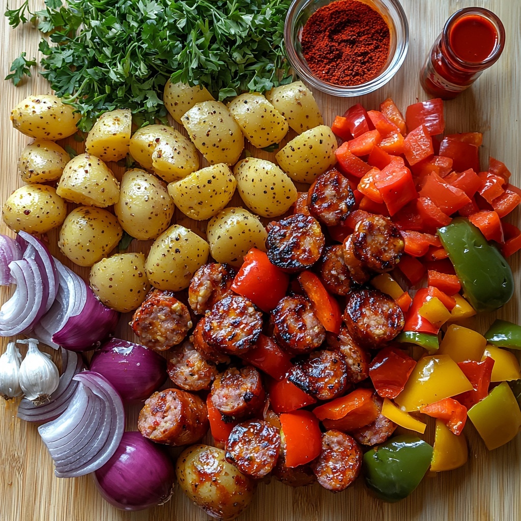 This Quick Cajun Sheet Pan Chicken Sausage & Potato Bake is a flavorful, easy-to-prepare weeknight meal that combines tender Yukon Gold potatoes, colorful bell peppers, and fully cooked Andouille-style chicken sausage, all seasoned with zesty Cajun spices and roasted to perfection on a single sheet pan. It offers a balanced mix of protein, veggies, and spices with minimal cleanup, perfect for a hearty family dinner.