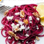 Plate your dressed beet noodles and generously sprinkle crumbled goat cheese and whole pecans on top. The creamy cheese and crunchy nuts add a wonderful contrast in both taste and texture. Now it’s ready to enjoy!