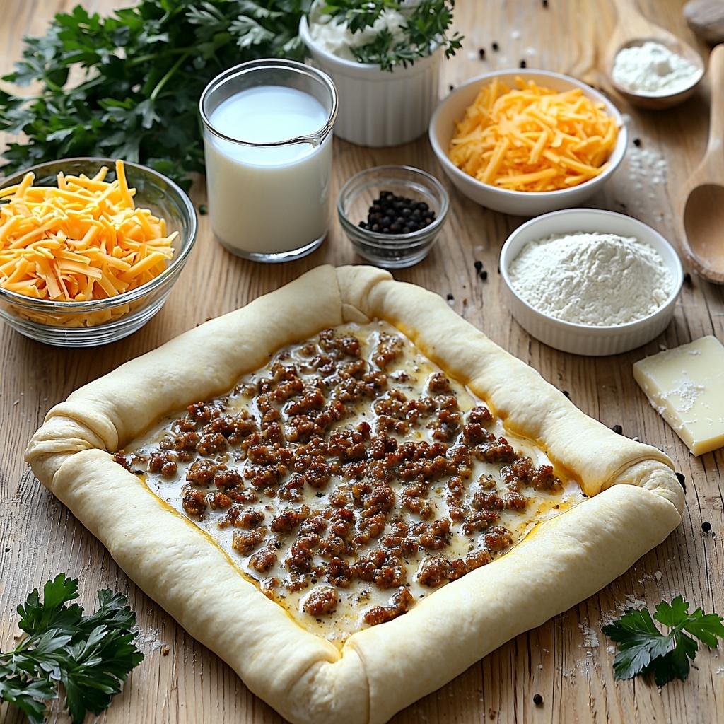 These simple ingredients come together effortlessly to create layers of wonderful flavors and textures in your Sausage Gravy Crescent Roll Breakfast Pizza Recipe. Each element plays a vital role—from the flaky crescent roll crust providing the perfect base, to the savory sausage gravy that wraps everything in creamy indulgence, finished with melty cheeses for that irresistible golden topping.