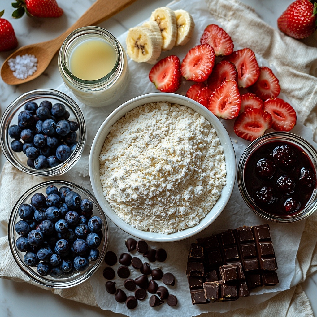 Here’s the magic lineup of simple ingredients that come together effortlessly to create this delightful dish. Each one brings its own special role, from the fluffy texture of the pancakes to bursts of fruity sweetness and rich, melty chocolate.