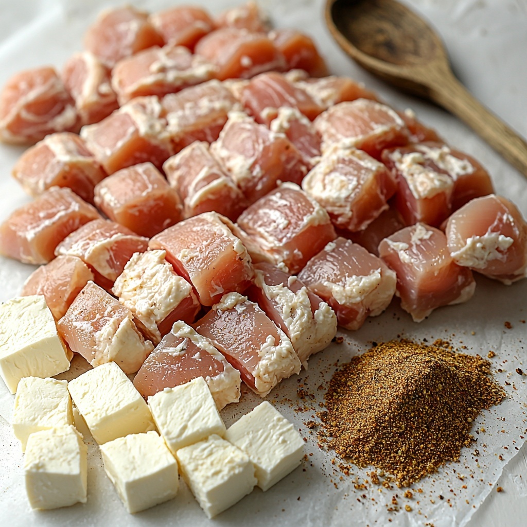 - Add Cream Cheese: Scatter the cream cheese cubes over the top of the seasoned chicken without stirring them in.