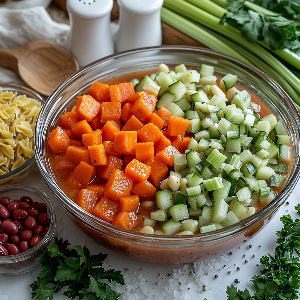 - Prepare the Ingredients: Chop the onion, dice the carrots, celery, and zucchini. Drain and rinse the kidney beans to prepare all the main components for the soup.