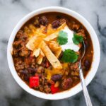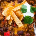 When it’s time to serve, the toppings bring the chili alive—sprinkle shredded cheddar cheese on top so it melts luxuriously into the warm chili. Add a dollop of sour cream to cool the spice, a handful of crispy tortilla chips or strips for crunch, and finish with sliced green onions for a fresh, zesty pop of color and flavor.