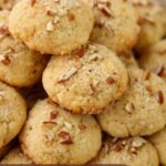 4. Form Cookies: Using a small cookie scoop or spoon, drop the cookie dough onto the prepared cookie sheet in evenly sized balls. If desired, sprinkle extra chopped pecans and turbinado sugar onto the top of each cookie dough ball for added texture and sweetness.