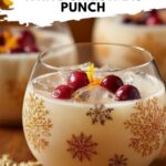 Use a clear glass punch bowl to show off the beautiful milky-white color, then float some sugared cranberries or a large ice ring studded with cranberries and mint for a dramatic effect. For a fun twist, try serving individual punch cups with mini candy canes hooked onto the sides for a festive flair that’s irresistible.